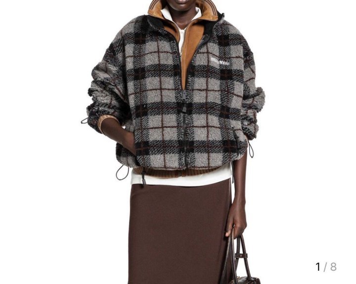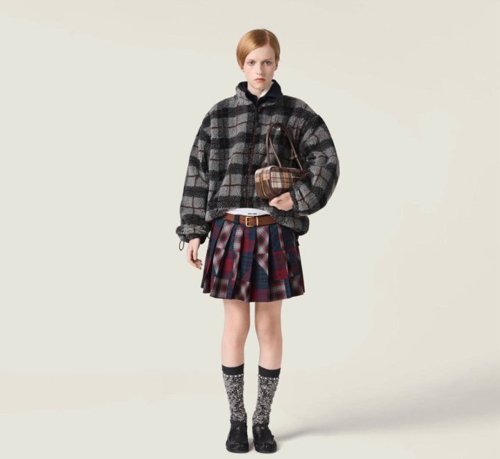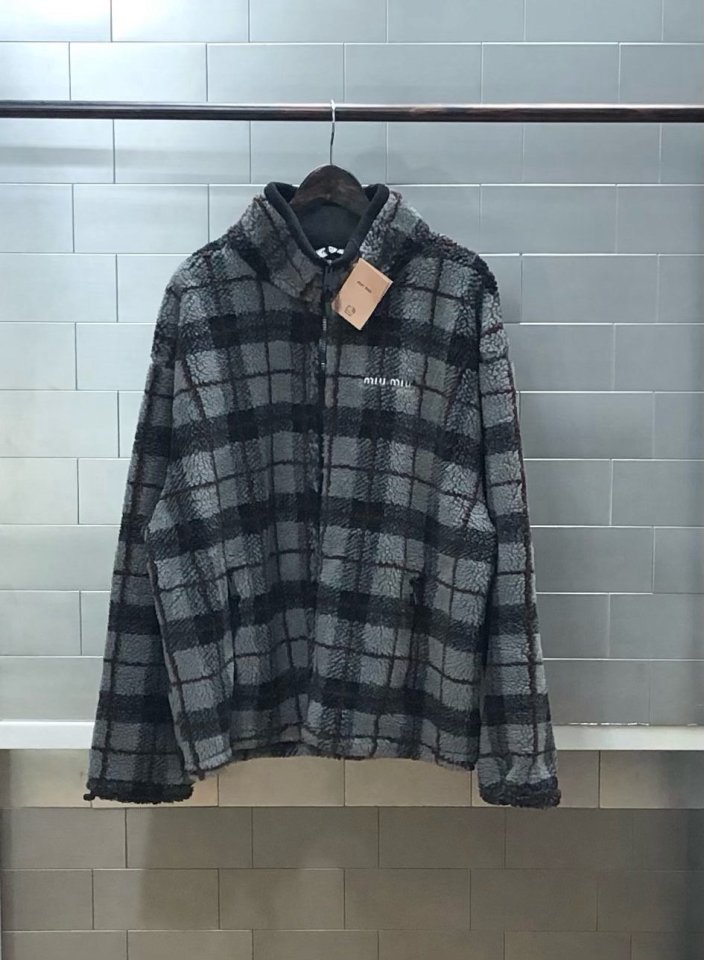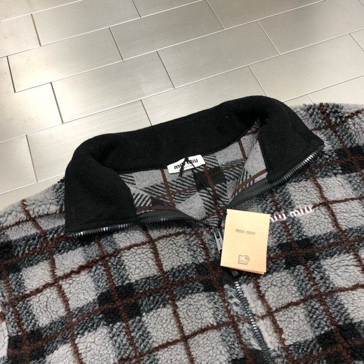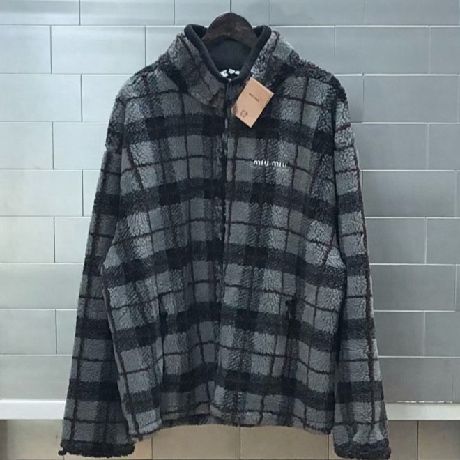 왼쪽 가슴 miumiu의 섬세한 자수로고가 새겨져 포인트를 주고 있으며, 클래식한 체크 패턴으로 유행을 타지 않는 디자인입니다.