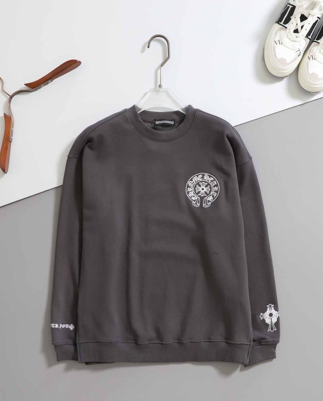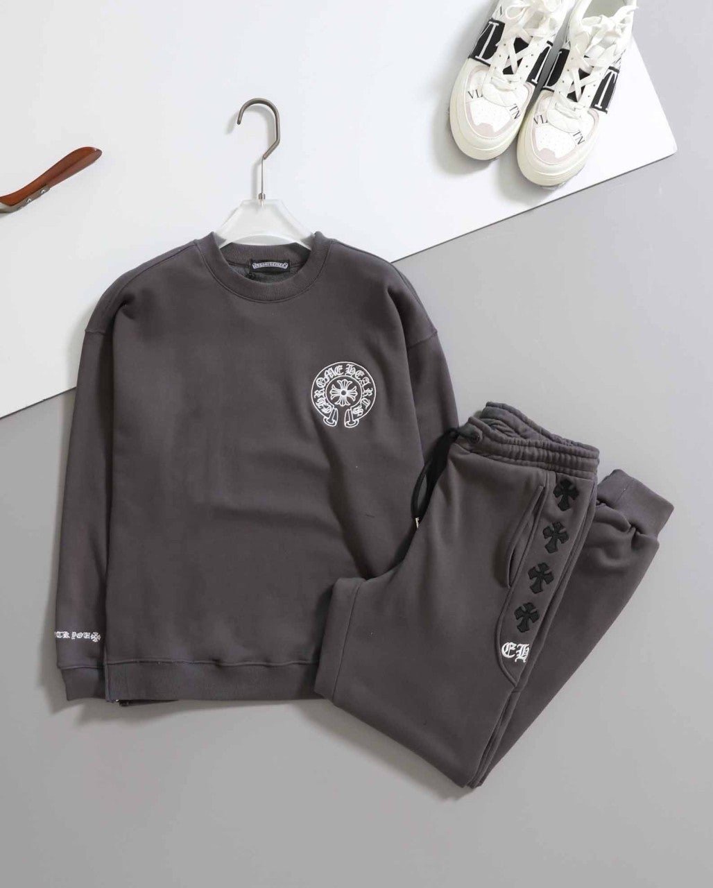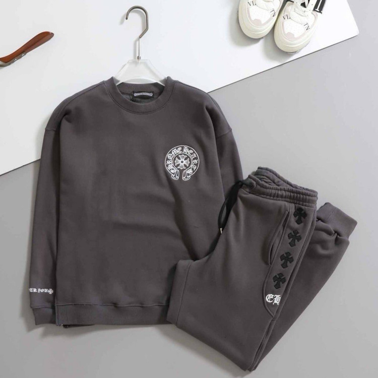- 그레이 색상의 긴팔 맨투맨과 조거팬츠로 구성된 세트입니다.