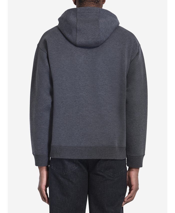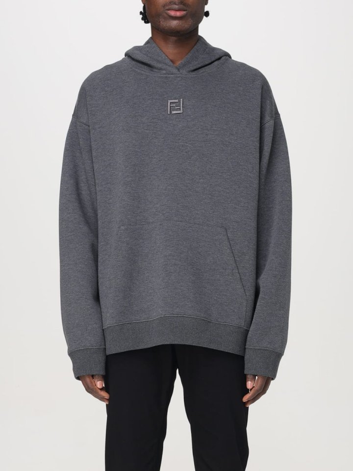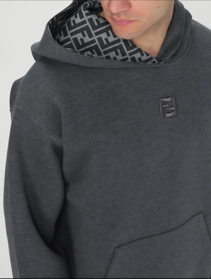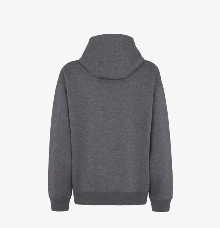후드에 조절끈이 달린 긴팔 스웨트셔츠입니다. 앞면에 캥거루 포켓이 있습니다. 그레이 멜란지 코튼 소재로 제작되었으며, 부드러운 그레이 안감에 그레이 FF 로고가 있습니다. 가슴 중앙에는 안감 색상과 조화를 이루는 FF 로고 자수가 있습니다.