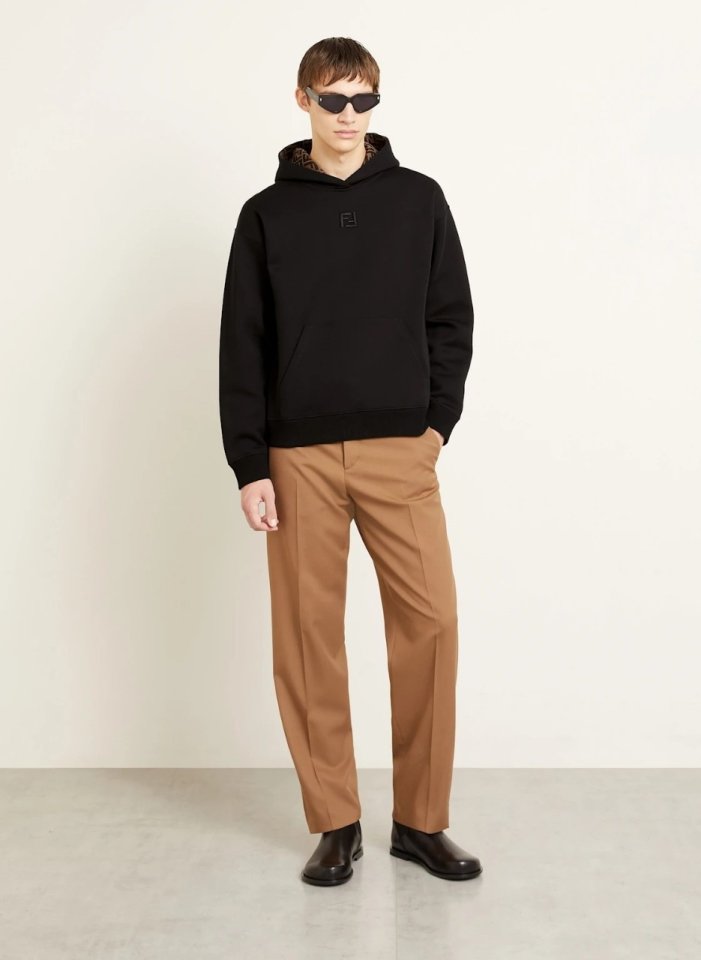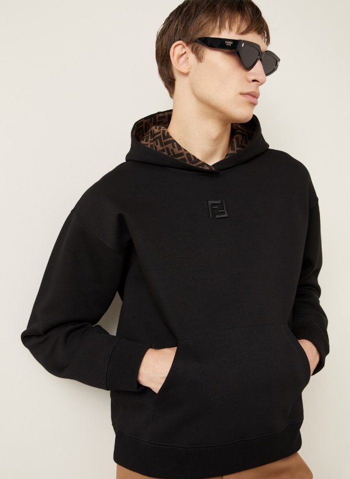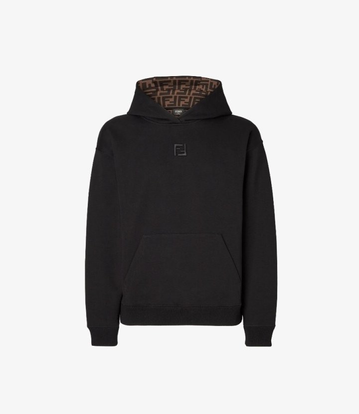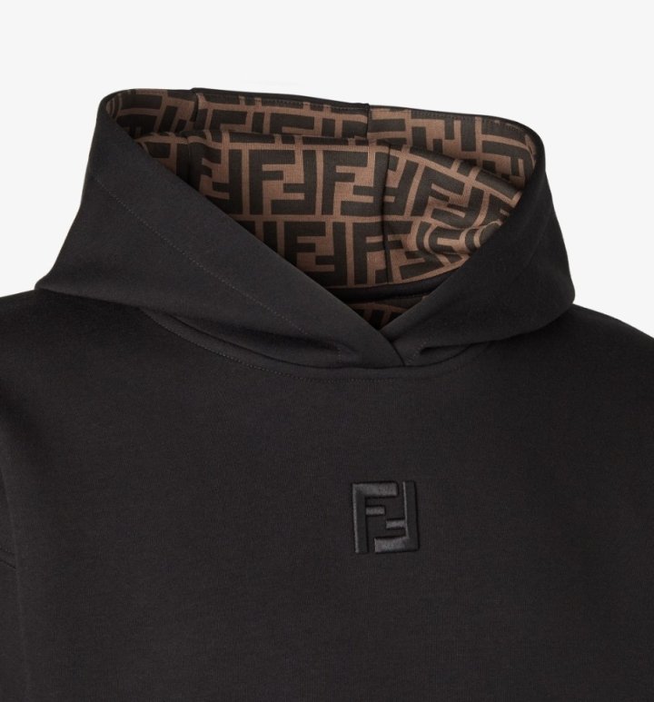 후드에 조절끈이 달린 긴팔 스웨트셔츠입니다. 앞면에 캥거루 포켓이 있습니다. 블랙 멜란지 코튼 소재로 제작되었으며, 카푸치노 브라운 안감에 검정색 FF 로고가 있습니다. 가슴 중앙에는 안감 색상과 조화를 이루는 FF 로고 자수가 있습니다.