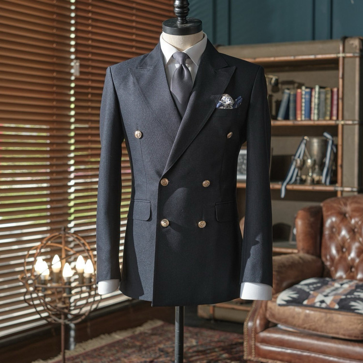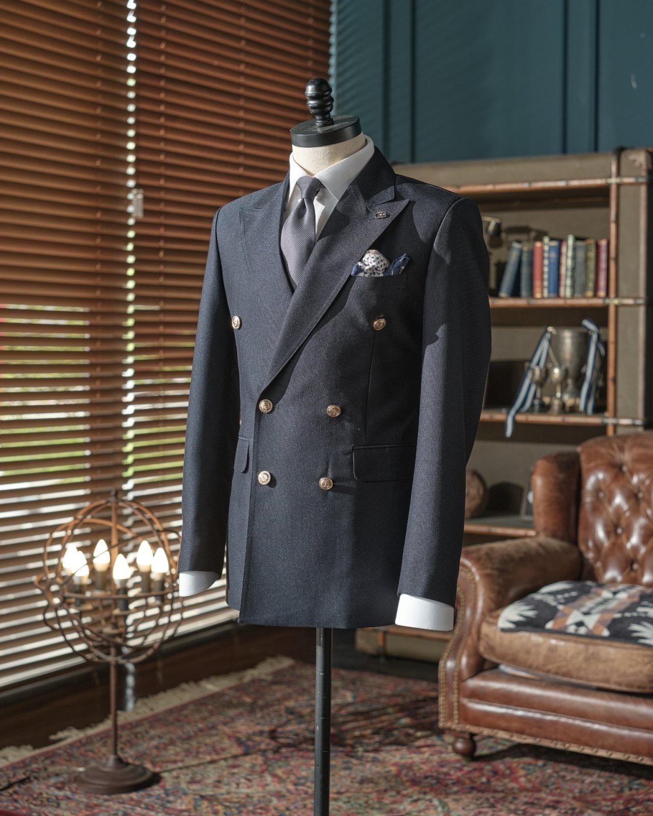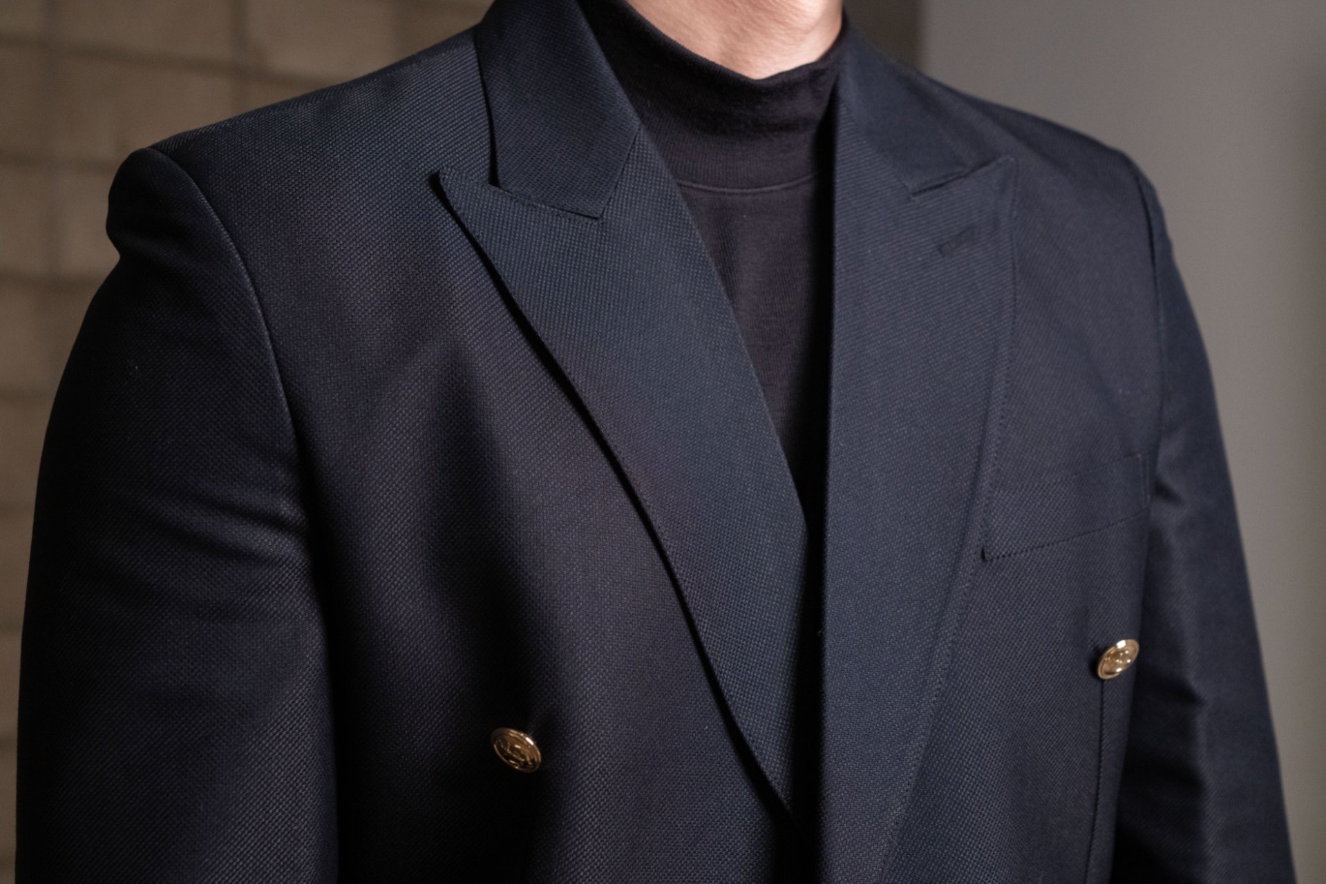 자연스러운 어깨 패턴과 라펠의 굴림 손목부분 의 금장단추